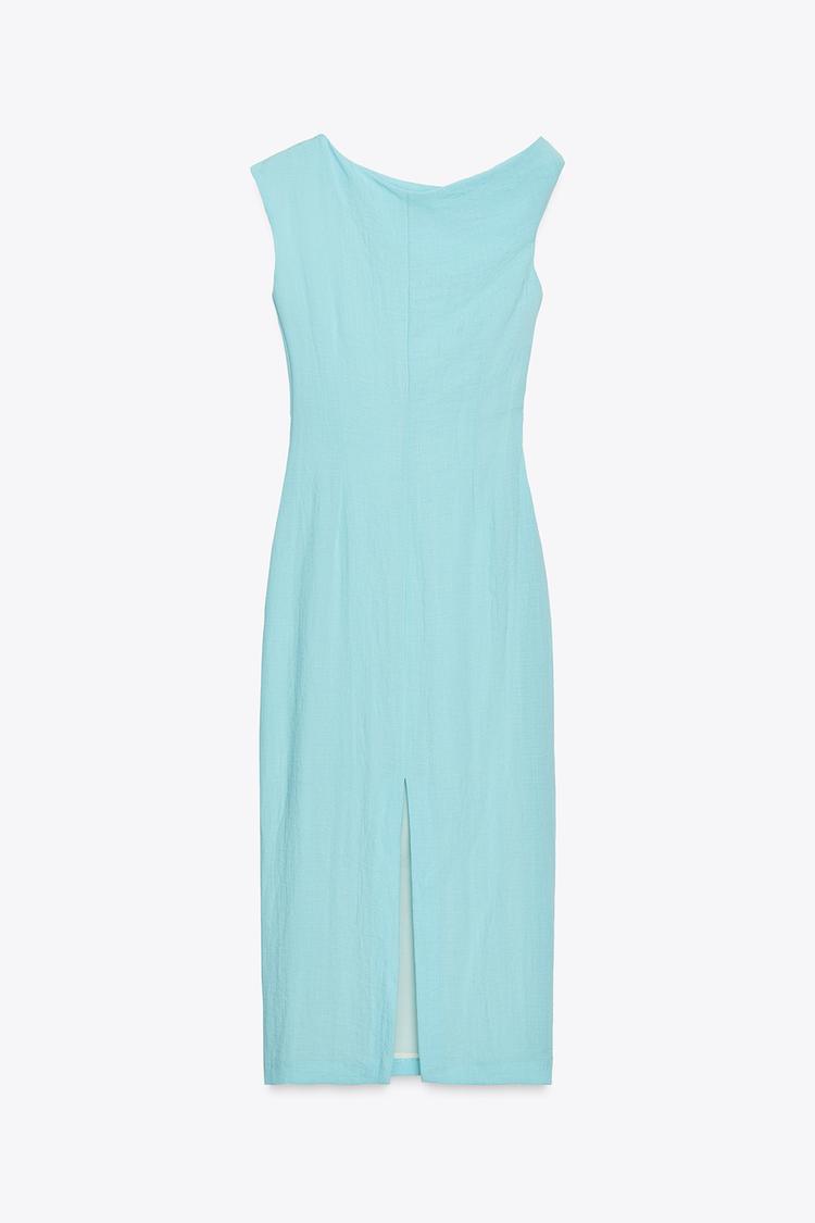 Dress with an asymmetric neckline and sleeveless design with a twisted shoulder detail. Featuring a gold appliqué detail at the waist, lining and a vent at the back of the hem.